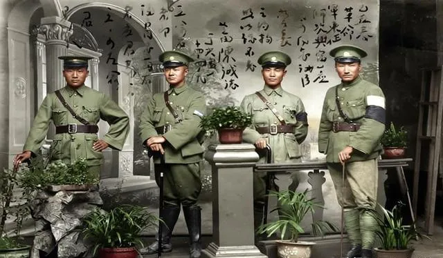 这张照相馆里的合影,臂弯处挽着黑纱的细节极重,规整军装把腰线勒得笔直,肩带压出一道深痕,镜头前人人站稳,眼底却压着难掩的哀色,背景画着拱券与盆景,纸糊的花草挡不住沉沉的心事,老师傅按下快门那一瞬,时间像是被按了暂停。