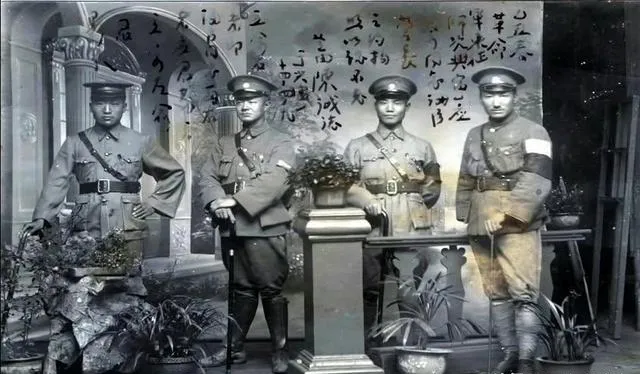 照相馆的盆景摆得规矩,四人手套都不戴,手心却攥得紧,黑纱象征哀悼,袖口那一圈白布在镜头里很醒目,写在背后的字像是留念与誓言,张张笔画挺硬,像刻出来的,老辈人总爱把情绪往心里压,留一句话,够用一辈子。