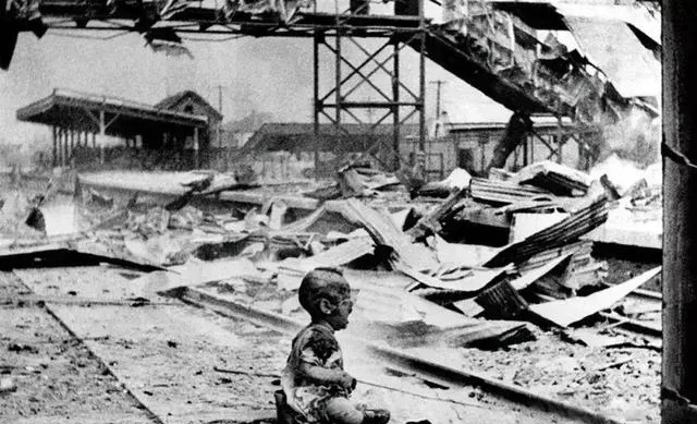 这一幕不用多说,图中婴儿满身伤痕坐在铁轨旁的瓦砾里,身后是倒塌的厂棚,变形的铁梁像扭成一把叉,风从空仓穿过去发出呜呜的响,孩子张着嘴哭,谁也接不住这声哭,爷爷说,当年他在后方看过类似的场景,一阵风过,尘土呛得眼睛都睁不开。