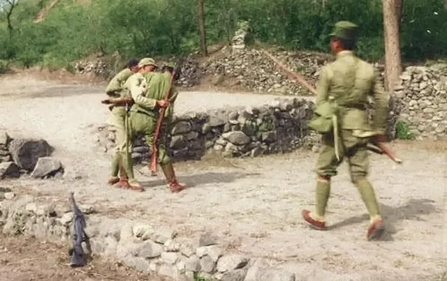 这个近身扭打的瞬间,是用刺刀贴身拼命的场面,前头的兵已经有点力竭,腰一沉却还往上顶,另一名战士抄着刺刀从后背补上去,石墙边落着一支枪,太阳光从树缝里泼下来,地面的灰扬起来一层薄雾,那一下下去,胜负就翻了个面。