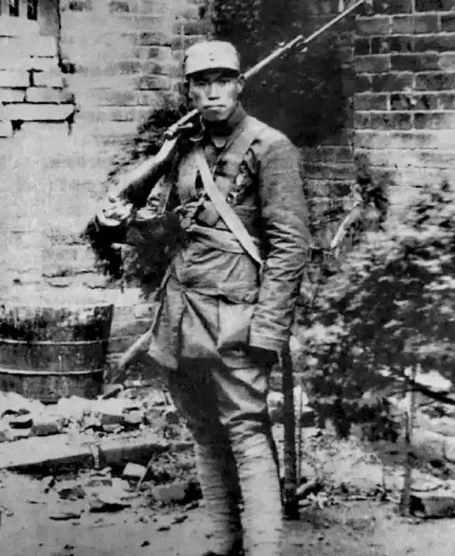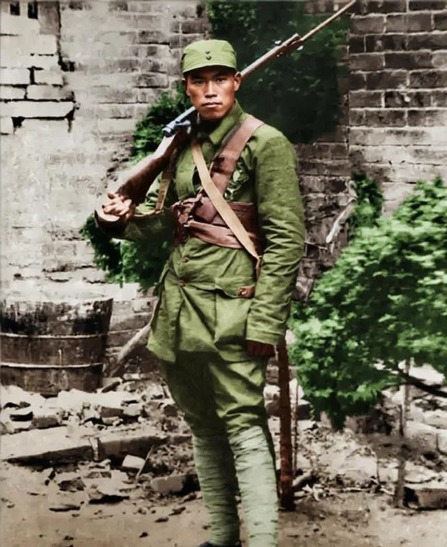 这一张,人站得直,步枪斜扛在肩窝里,枪托贴着棉服,皮带从前胸绕过去,再从腋下穿回来,打了孔的皮眼有亮亮的油渍,背景是被炮火震过的砖墙,碎砖旁边一只老木桶半埋在灰里,他的眼神劲道十足,像刚从火线退一步喘口气,又随时可以踏回去。