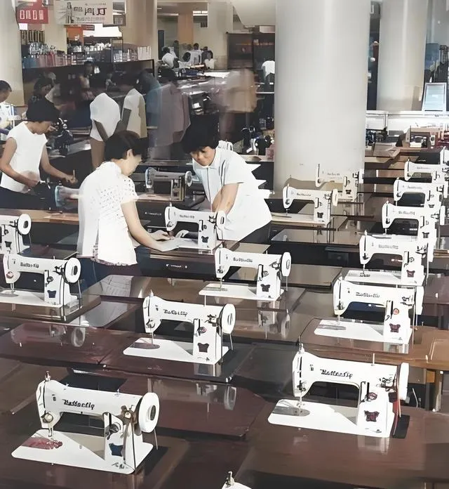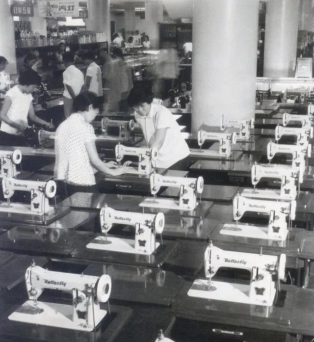 这张黑白的还是缝纫机专柜,同样是蝴蝶牌,镜面台板把人影照得碎碎的,售货员把布条夹在压脚底下,一抬一放给你演示走线,叔叔在旁边说,结婚“三大件”没它不行,没票也没戏,这就是当年的社交硬通货。