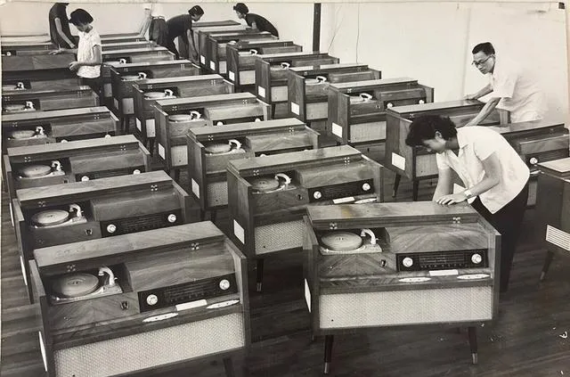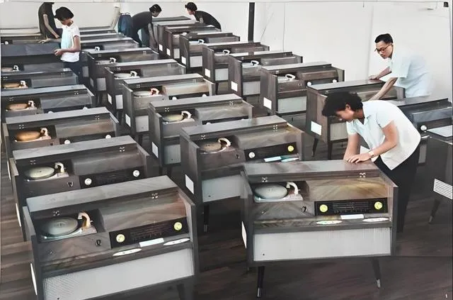 这张黑白车间图把飞乐两用机摆成了阵,工人弯腰拧脚钉,四只锥形木腿像穿了尖头鞋,柜体前的金属网罩住喇叭,师傅抬手招呼小徒,别用蛮力,螺丝牙一滑就废,一句话把我们这些半吊子给教住了,现在拧个家具都靠电起子,那会儿一把改锥吃遍天下。