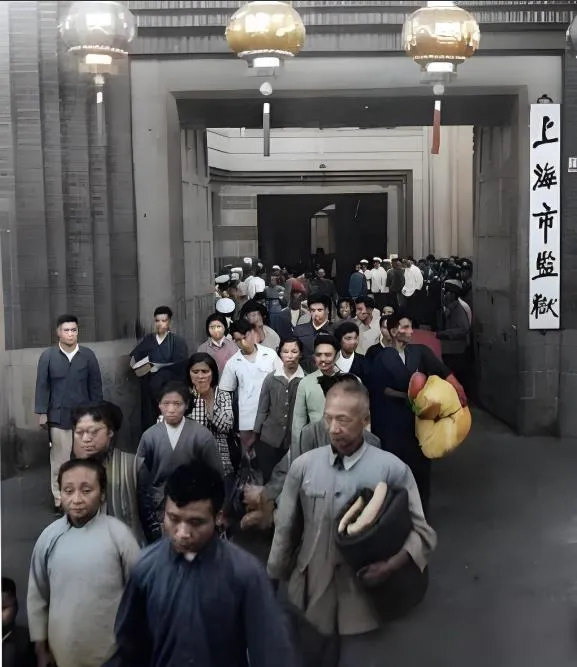 这两张队伍往外走的是特赦出监的场景,人们抱着铺盖,表情复杂,门口挂着灯笼,墙上贴着“上海市监狱”的牌子,外头人群让路,空气里像有股新鲜味,外婆说那会儿讲究改造好再放,人走出来得重新过日子,找活,认错,慢慢把心安稳住。