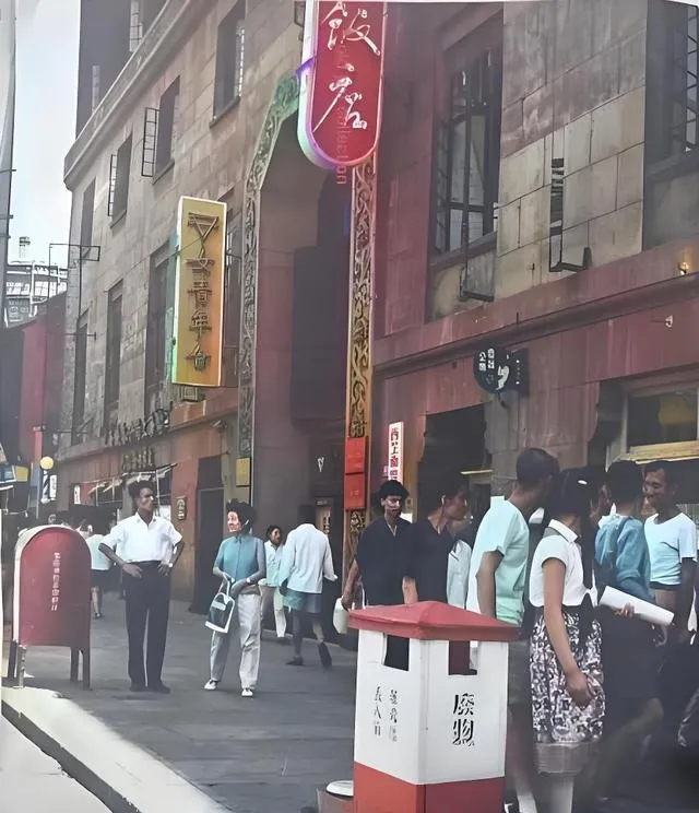 这门脸上写的是女青年会,旁边还有淮海饭店的招牌,洋气门头下摆着垃圾箱和邮筒,路口人来人往,有人端着搪瓷饭盒站聊天,妈妈笑说这地方最会“混搭”,西洋牌匾底下卖本帮小菜,中午一碗浇头面,下午进屋里借个场地开会,上海人的精明就长在这些角落里。