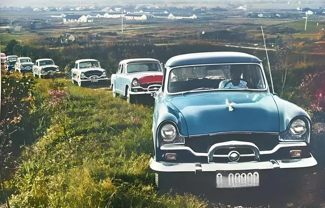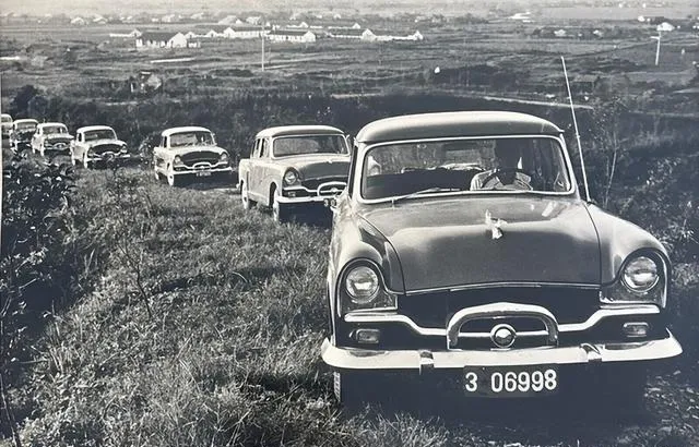 这队开上坡的叫凤凰牌轿车路试,车头镀铬亮得晃眼,护杠上带个圆环,司机握着大直径方向盘,土埂路颠得人直点头,师傅说厂里没试车场,只好往郊外去找烂路,哪儿响就在哪儿加固,哪儿松就在哪儿改图纸,私家车想都不敢想,能把车造顺了就是大事。
