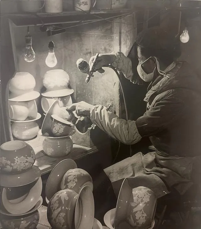 这手里捏着喷枪的工人是在给搪瓷盆喷釉,一手扶胎一手扣扳机,雾化的釉像细雨一样落在白坯上,灯泡吊在头顶晃晃悠悠,师傅戴着口罩不多话,等颜色铺匀了,轻轻转开转台,摆到一边等进窑,爸爸说火候是个掐表也掐不准的活,靠眼力劲儿和经验。