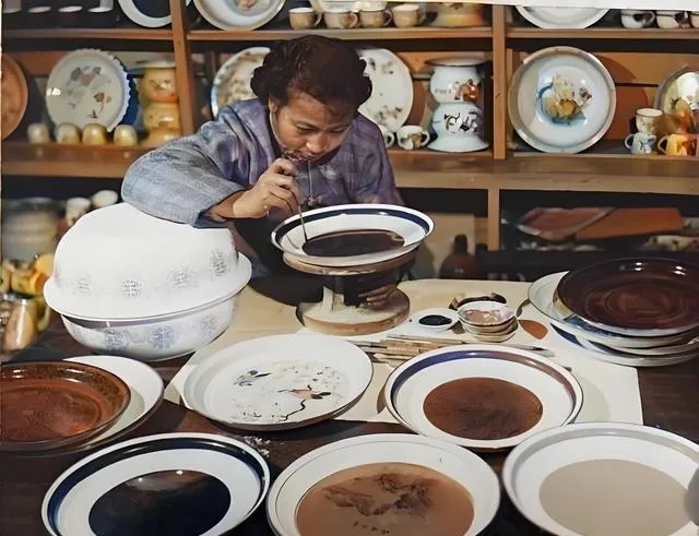 这位低头捏笔的是手绘搪瓷的老师傅,圆台慢慢转,边上的颜料碟像月牙,一笔下去留细线,二笔铺底色,最后添上一点红,盘子就活了,讲究的活都在边角,收口利不利索,一眼见分晓,现在流水线上啥都快,那时慢慢磨,出来的东西有股子“手温”。