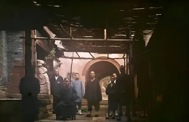 这个昏暗的天井是僧舍,木杆撑着简易棚顶,几位师父站坐不同,神情各异,墙角的石鼓磨得圆润,像被岁月摸出来的光,这一幕安静得很,仿佛能听见檐下水滴落在盆里的声响。