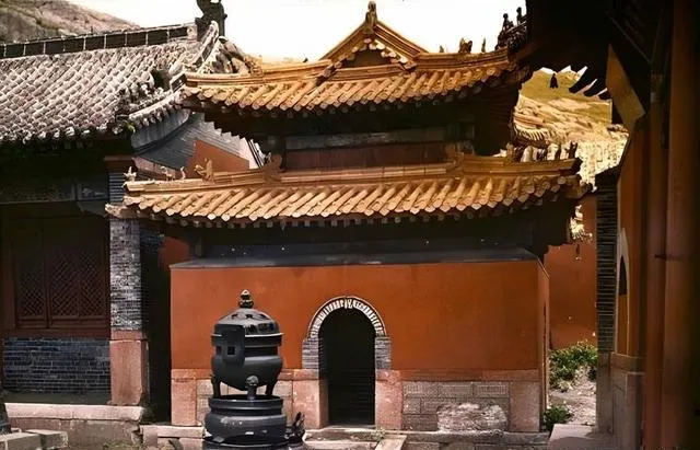 这座小殿墙体是橘红,屋顶的黄瓦亮堂堂,香炉圆滚滚立在前头,炉耳子像两只把手,殿门里的黑影深得看不清,门楣上头雕着简单的卷草纹,手工粗,却有味道。