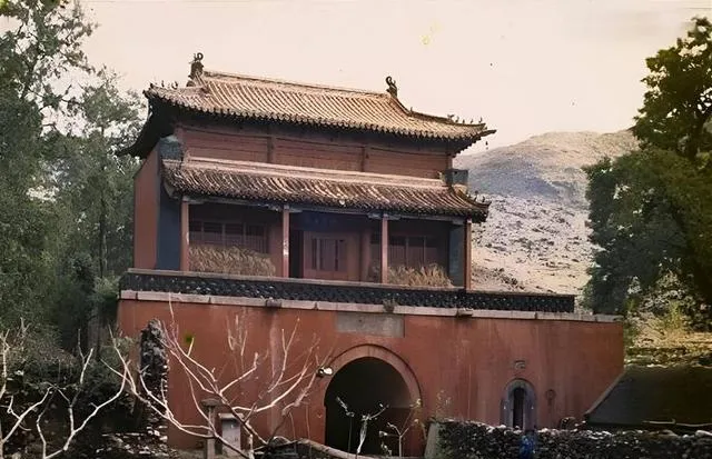 这座两层山门红墙黑瓦,檐角挑出去一点弧度,门洞像一只闭着眼的猫,静,旁边树影窸窸窣窣,风一过就扫在墙上,留下一片斑驳。
