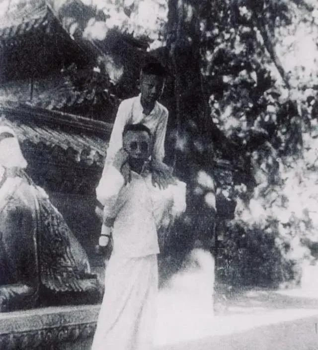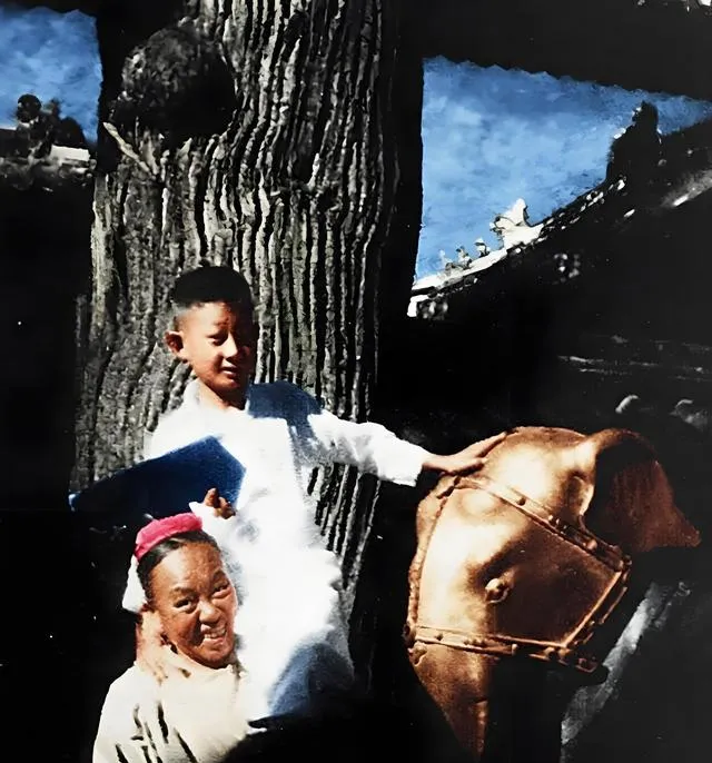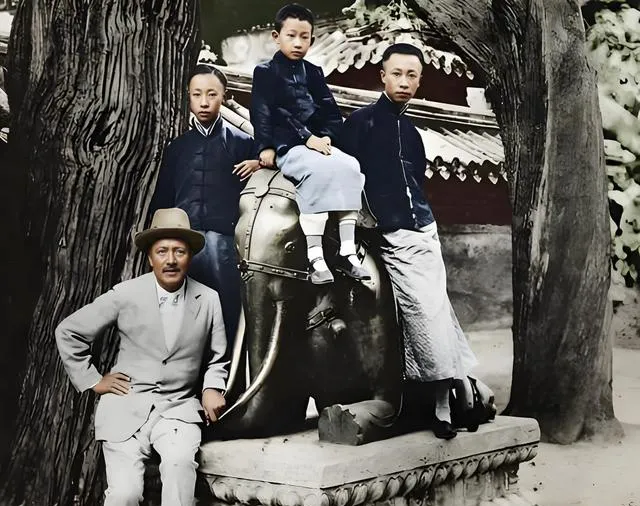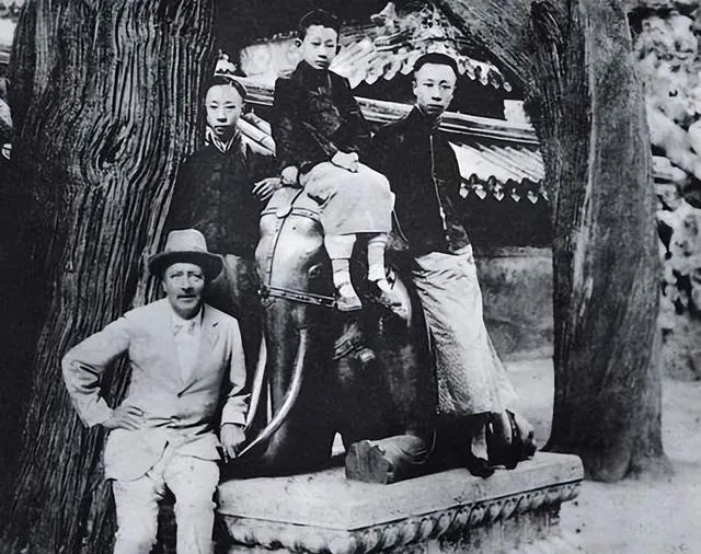 图中那头亮堂堂的铜象叫镇园瑞象,象背光滑发亮,都是手摸裤蹭磨出来的包浆,树根粗得像龙爪,石座边角被鞋跟磕出小口子,最抢眼的是小男孩坐在象背上,旁边站着穿西装的外籍先生,短帽斜扣,神情有点得意,这一幕把宫里中西碰撞摆在同一画框里,老照片一张,味道全有了。