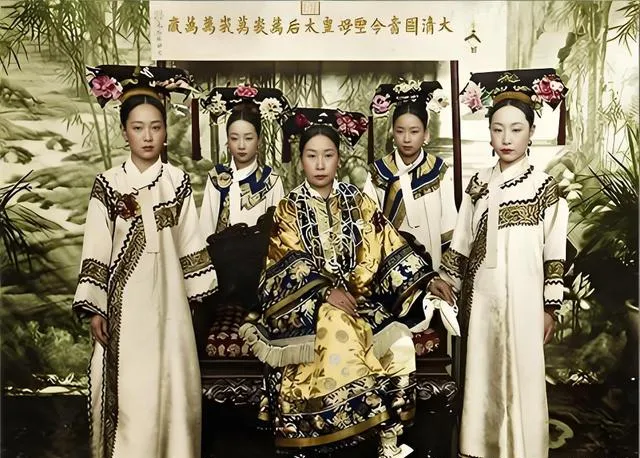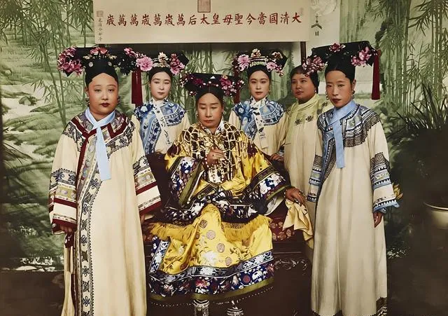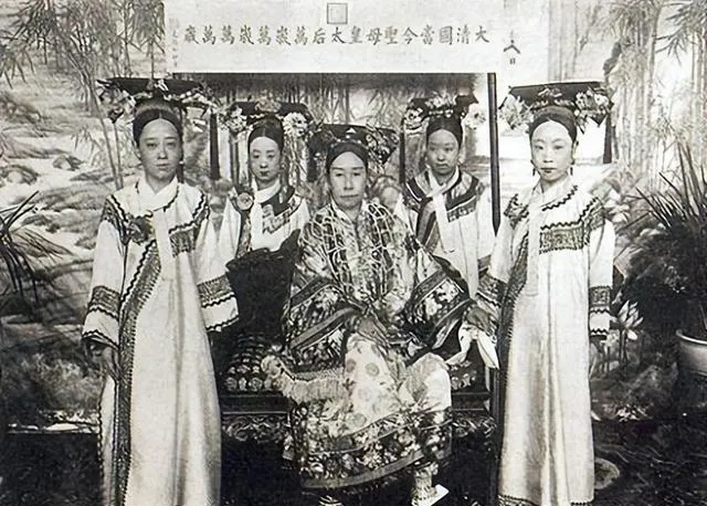 这个坐具叫龙纹御座,靠背硬挺,扶手厚重,身后那条横幅写着**“当今圣母皇太后万岁万岁万万岁”**,字一出来气派就到位了,御前女官排在两侧,眉眼淡而稳,袖口里藏着小手炉,冬天屋里虽有地龙,衣摆边还是会掀起一层寒意,现在写条幅多用打印,那时一笔一划落下去,墨味儿比威仪还浓。