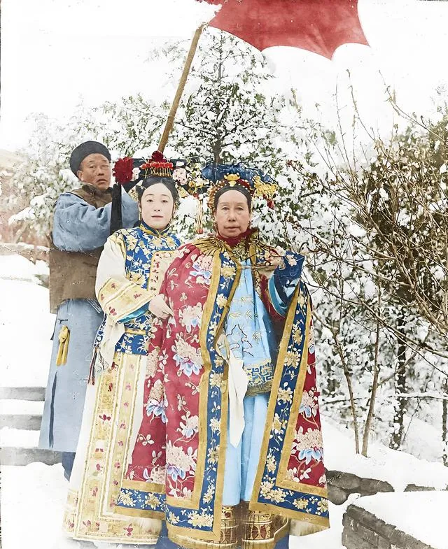 这把大伞是御前油纸伞,伞面厚,杆子直,后头的小太监费劲托着,前面两位披着团龙织锦的大氅,脚下台阶被雪摁得死白,呼吸都带雾气,外婆看了叹一声,说那时冬天冷得更实在,现在城里雪一下就化,拍照想要这味道,可不容易。