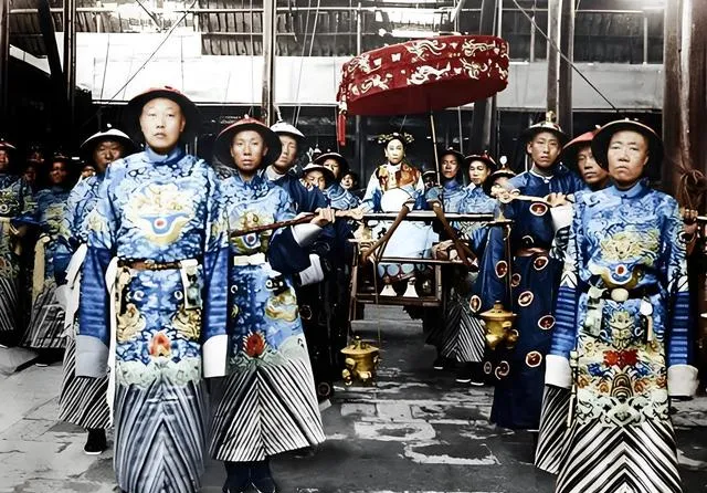 这个抬架叫凤辇,上头罩着绣花的油罩伞,两边持扇的内官一步一眼,前排开道的身形像堵墙,衣服上团龙与海水江崖纹一层压一层,地上还趴着一只小京巴,一动不动像知道规矩,奶奶说开道要看人步幅齐不齐,乱半寸都要挨训,现在队列多为表演,以前每一步都写着规矩。