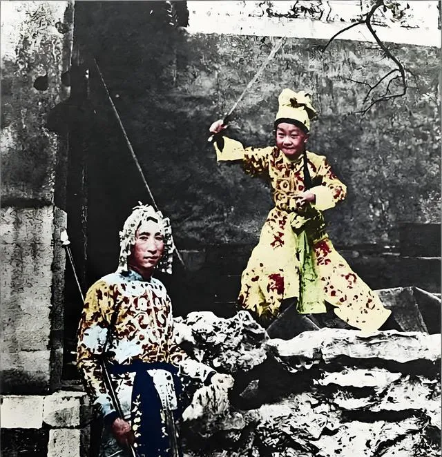 这个鲜亮的戏装叫靠旗袍带,衣身上绣的蟒与云纹密密一层,小家伙举着小杆子,一步三抬腿,脚底下是叠石做的小台子,旁边的大人面沉如水,盯着动作不放松,爷爷说宫里练功先练站桩再开嗓,冬天哈出的白气都要跟着板眼走,现在学戏的多在镜子前纠细节,当年只认师父手里的戒尺。