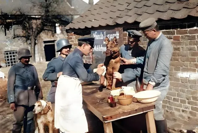图中这张临时搭的木台就是军犬救护台,木板还带着刨痕,碗盆药瓶杂乱一桌,一个戴围裙的军医按着狗子的下颌,另一人托住前腿,套着口罩的小狼狗直立着,耳朵抖了抖却不叫唤,旁边的士兵笑着逗它,台下还蹲着一条大猎犬,像在等号,奶奶看见这张图就说,狗也是兵,战地上也得先把它们的伤口洗净,不然感染来得快。