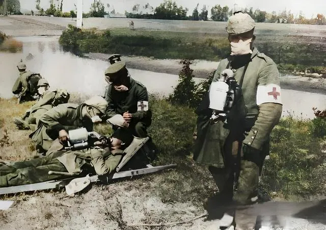 这组是前线卫生队,河风吹得草伏下去,担架就放在草茎上,卫生兵把金属罐的氧气托到伤员嘴边,臂章上红十字在上色后很扎眼,我注意到瓶塞的磨痕和布带的褶子,都说明用得很急很频。