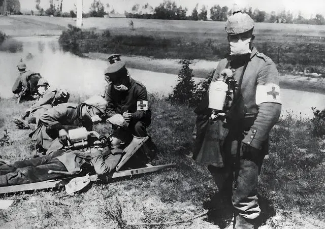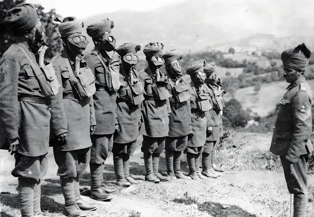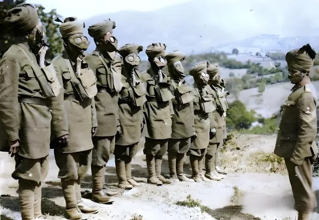 这排戴头巾的士兵正在练防毒面具,圆圆的镜片在阳光下发亮,口鼻处的滤罐像挂着的壶,他们站得笔直,指挥官略微前倾,仿佛在说别紧张,按扣往上一卡就行,那时候毒雾一来,慢一步就要命,现在看这套装备虽然笨,可在当时是一线命。