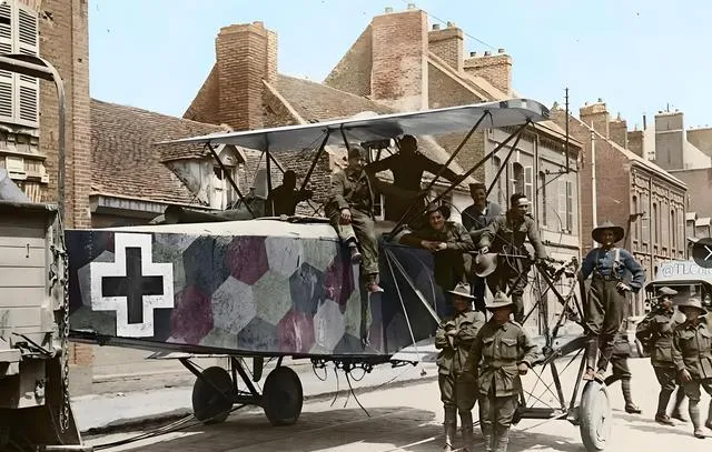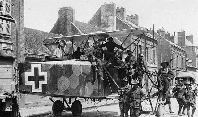 这个大块头是被拖走的双引擎轰炸机,机身侧面的铁十字斑驳得像掉漆的家门,协约国士兵爬上机架合影,有人揪着绳索,有人坐在起落架上抽闲烟,这一幕上色后格外市井,战场的废铁在城巷里显得突兀,可人群的表情就像搬家时短暂的轻松。