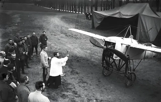这个小巧的单翼机前站着身披白袍的神职者,举手作祝福,飞行员还没系好安全带,队友围成半圈,地上草皮被轮胎压出一道暗痕,妈妈看了说,那时候人更信心里这口气,现在上天靠备件和系统,也还是会在起飞前轻轻摸一下机身,求个顺。