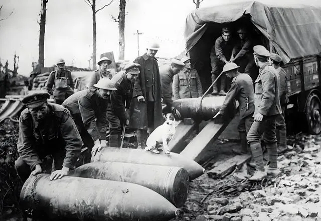 这枚大家伙是重型高爆弹,圆腹紫红,表皮抛光的冷光在彩色里更吓人,士兵们顶着肩膀、用木板做坡道,齐声喊着号子往下滚,旁边还有一只小白狗跳上弹身坐着,像个不知轻重的小孩,照片外我忍不住倒吸口气,它要真炸了,地面都得塌一大块。