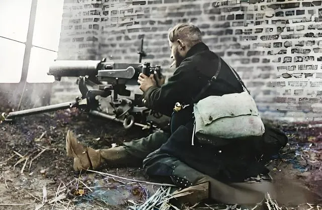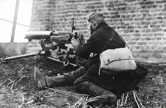 这个铁家伙叫马克沁机枪,三脚架叉在泥里,枪管粗得像水管,射手背个帆布包,肘部撑着干草,墙缝里透进来的光照在准星上,能看见微微的灰尘飘着,他嘴角像是含着烟头,整个人绷成一张弓,等着前方露头。