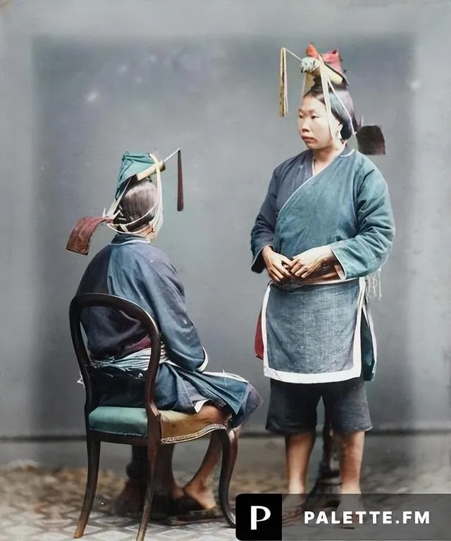 这个高挑的发式叫簪花围,两侧插着长条挑牌,走起路来会轻轻摆,发髻用布帛裹紧,外头再压一层青绸,后脑勺别着篾片防变形,正身那位穿的是细布对襟短衫,腰里系围裙,家里干活就这么穿,我外婆笑过我,说“别看打扮朴,会过日子才是本事”,以前一头发就能看出地域门道,现在发型都在理发店里归了类。