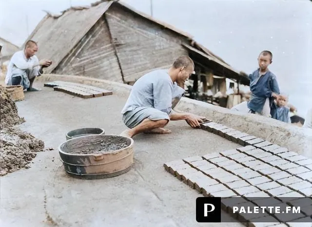 这个场景里最关键的家伙叫木模,旁边那口浅浅的铁皮盆是泥槽,湿泥在手里呼啦一转,往木模里一按,抹两下边角,起模就是一块坯砖,晒场顺着坡势一排排摆开,早晚各翻动一次防翘边,小时候我去砖场玩过,手一按就想学,师傅笑着说别急,泥要揉到“起筋”,模具要先蘸水再撒细灰,不粘手才好起活儿,现在城里盖房子钢筋水泥嘣嘣响,那时候全靠这种坯砖,一道晒场就是半条街的房梁根基。