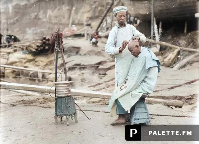 这个算行走的手艺铺子,叫剃头挑子,左边那根竹竿挑着箱子,箱里有剃刀、刮脸盆、香粉盒,地上支着小火炉,水暖了才好刮脸,剃头师傅给人披个大围布,凳子是随手倒扣的木桶,刀面在皮条上唰唰一蹭,贴着头皮走一圈,发际线立马利索了,外公讲过,剃头最怕的是风,风一大刀口就飘,遇上江风顶着剃,师傅心里得有数,手得沉,嘴还要甜,边剃边聊,消息就这么在江滩上串开了。