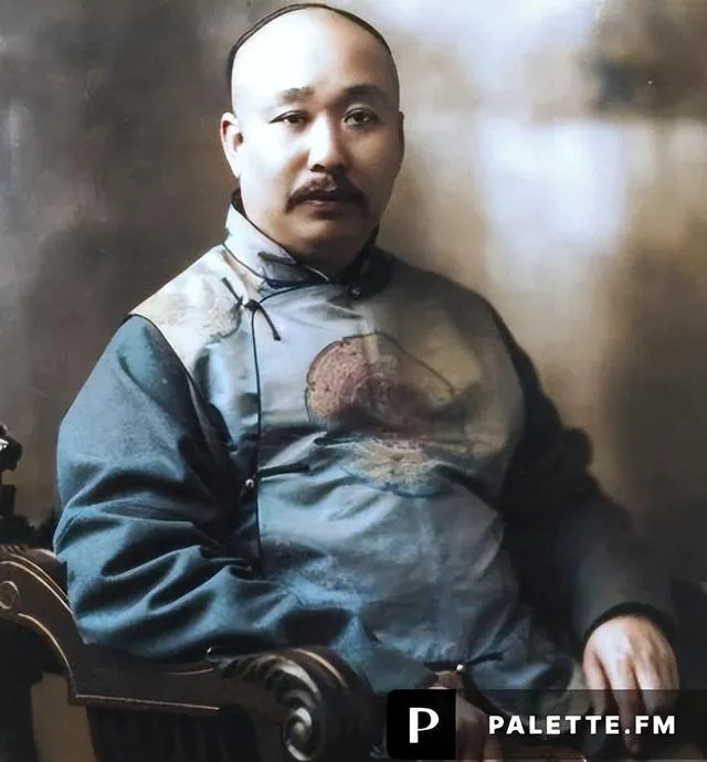 这张坐像里,胸口圆绣叫团龙补服,绸料泛着旧油光,底子是青灰,团圆里一团晕开的霞纹,袖口压得整整齐齐,手边那把弯扶手是太师椅,攒斗纹路厚实,坐上去人会不自觉挺一挺背,我小时候淘气,拿手指在这种椅扶手卷纹里绕圈,妈妈一巴掌把我手拍开,说别在老物件上抠抠搜搜,沾了汗就难看了。