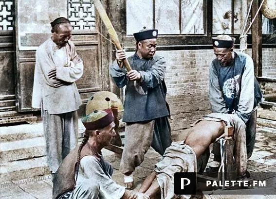 这个画面里抡起来的叫刑杖板子,压在地上那条长凳叫枷凳,看似要落下去,裤子却好端端没脱,摆拍的痕迹一眼就看出来,站在一旁的人正打量镜头,眼角还带点好奇,爷爷说,真要行刑不慌这个阵势,打也不会让你挑时间摆姿势,现在我们看照片,会把它当旧时宣传照看,那个年代的人就把它当活见识。