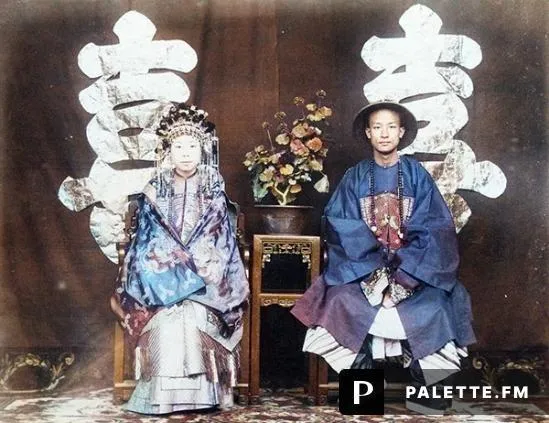 这张婚照里,脑后两只大囍字是糊纸剪就的,女家的凤冠帔帛压得额头很低,珠穗一串串垂在腮边,新郎右手压着绸段,椅子夹在中间像个证人,摆拍讲究对称,左一束花、右一块光,妈妈看见这张老照片笑我,说你要是拍成这样,回头又得被朋友笑话了,我说可不,那时讲礼,现在讲松,一样都不亏心。