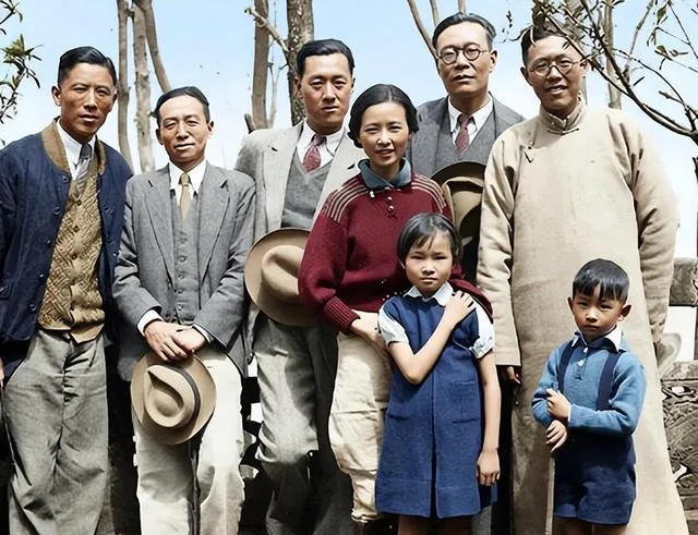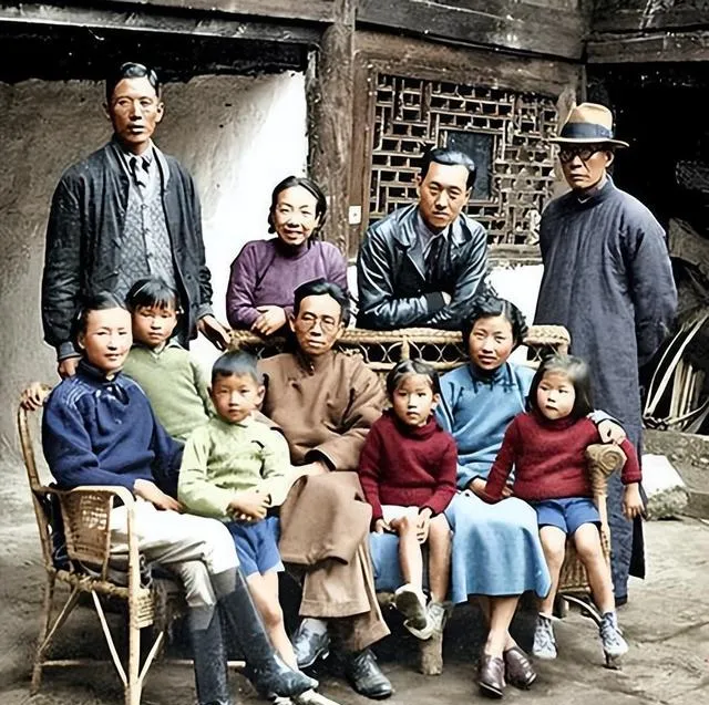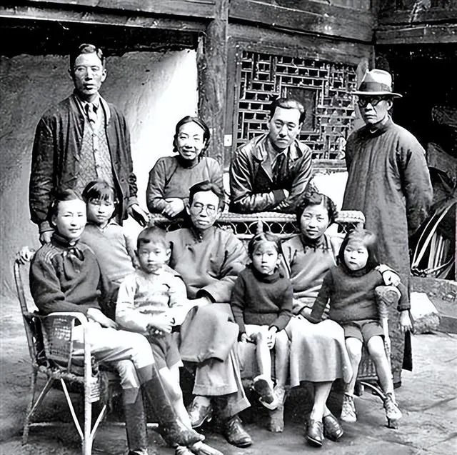 这个场景叫朋友们的院口会,粗枝秃树影子斜着落在墙上,男士们手里抓着呢帽,呢子外套褶子清楚,站在中间的姑娘穿针织套头衫,袖口有条纹,身边两个小孩靠在大人腰侧,笑不露牙,大家一字排开,说是合影,其实就是课间歇口气,谁说学问人一天到晚只会皱眉头,有难同当,拍照也要挤一挤肩膀。