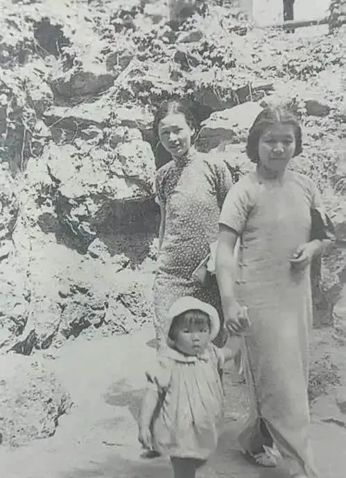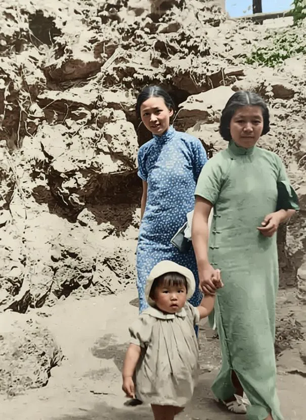这个手牵小娃的就是那位阿姨,旗袍裙摆扫过砂砾路,蓝底碎白点的那件,翻看照片最先看到的就是一只小手攥着大手的用劲,孩子戴小白帽,脸鼓鼓的,眼睛却警醒,像是刚问完一个问题还等着回答,旁边姊妹俩相视一笑,袖口里露出折好的手绢角,走到阴凉处歇一口气,再去看石缝里的花。