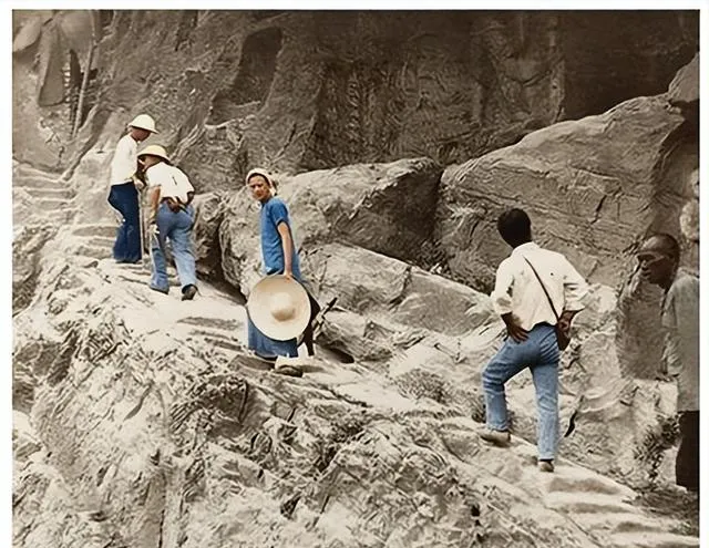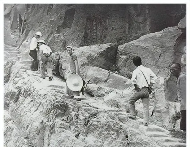 这个险坡叫南二十四洞旁的石阶,石面纹理像刀刮一样,踩上去滑溜,小队里有人负着包,有人弓腰探看刻痕,图中回头的那位手里拎一顶宽檐草帽,胳膊贴着身体压稳了重心,身后人提醒一句,小心脚下别踩空,记要怎么算,洞口到洞口的距离用脚步量,再回去折算到图上,这些细碎活儿,急不得。