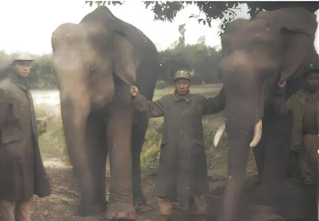 这张同角度的黑白片更朴素,大象还是那两头,人却明显累多了,眼下全是阴影,照片没说话,可你能懂,行军的日子越长,合影就越像一种打气,给家里人也给自己一个交代,咱还好着呢。