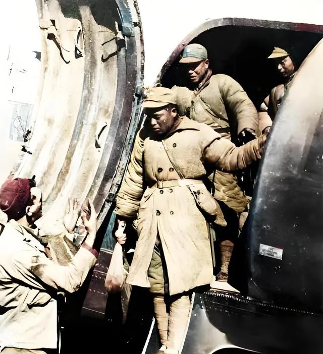 这个银白的大口子叫舱门,弧线亮得刺眼,士兵拎着挎包一步探出去,脚下空空的梯级抖了抖,外头风把棉衣吹得鼓起来,旁边美军伸着手示意抓稳,落地那一刻没有仪式,只有鞋钉子咯吱一声扎进尘土,心里跟着一沉,战场到了。