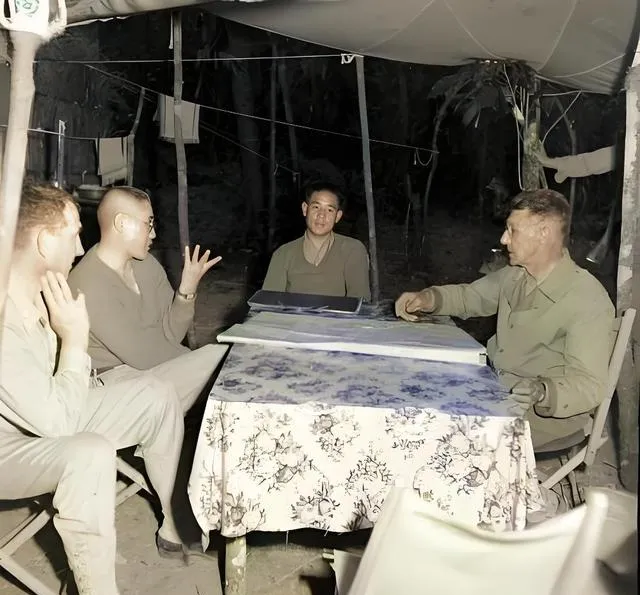 这张桌布花哨得有点出戏,其实是临时铺的军帐会议桌,地图一摊开,手指在河谷和山脊上蹿,外头虫叫连成一片,灯下人影把疲惫藏在袖口,年轻军官挥着手比划,老外参谋低头记着术语,谁也没提困,谁也没提家,这桌上只有路线和时间。