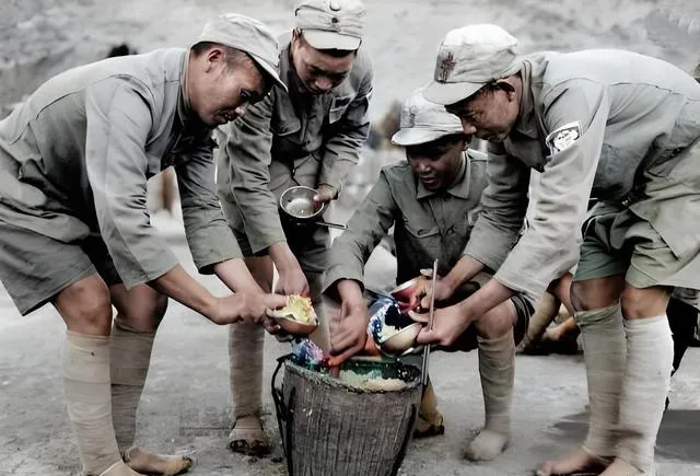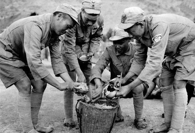 这个木桶叫伙食桶,边口磨得发亮,米饭冒着热气,里面掺了豆子和点咸菜,弟兄们一手碗一手勺,抢的不是多,是热乎,山风一吹就凉,站在怒江边吃饭要把耳朵竖起来,炮声离得近,抬头的功夫就得把两口咽下去,谁也不耽误谁。