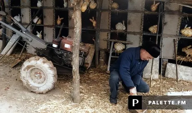 图中这台红机头的小四轮,老人叫它“手扶挂斗”,前头一盏圆灯鼓鼓的,后面拖着木板栏的斗子,轮胎上全是泥趟出来的齿痕,鸡兔窝就在旁边,秸秆铺得厚厚的,机身冷了就靠墙打个盹儿,等谁一脚油门,它立马醒过来。