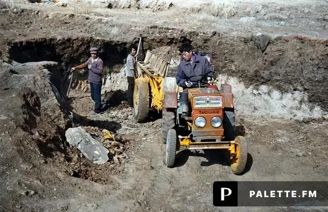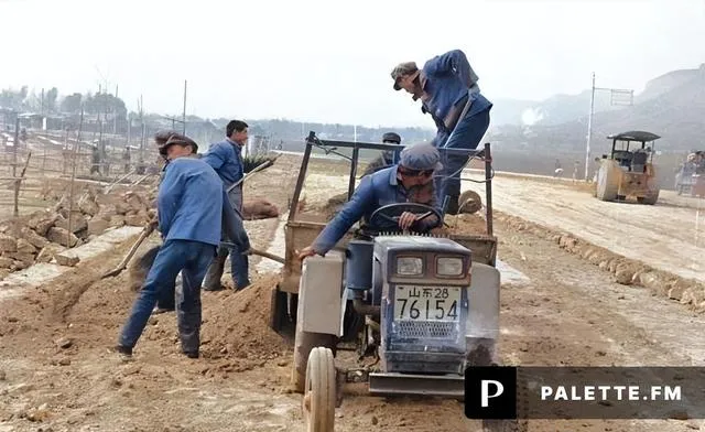 这辆窄车头的小拖,正往沟里倒土,几个人铲子抡得飞快,师傅一边看后视的铁框影子一边喊,来来来,再来半斗,路基得起肚儿才结实,那时候修路就靠这么一车一铲,人停机不停,天黑了再点马灯接着干。