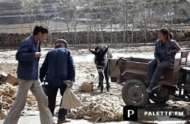 这张有意思,驴车没下火,机动三轮也在等活,人一手提袋一手掰馍,谁都不闲着,那会儿真是你方唱罢我登场,老驴认路稳当,拖拉机跑得快省劲,能挣点油钱就算一桩。