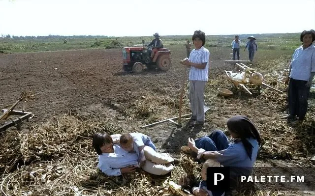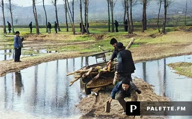 车停在田埂,几个小伙往水面伸手去捞木头,木料湿重,拖拉机怠速哧哧喘气,像催人加把劲,拉上来就码在斗里,回去给生产队修桥板,脚下一滑也不喊苦,忙活一下午,衣裳都贴在背上。