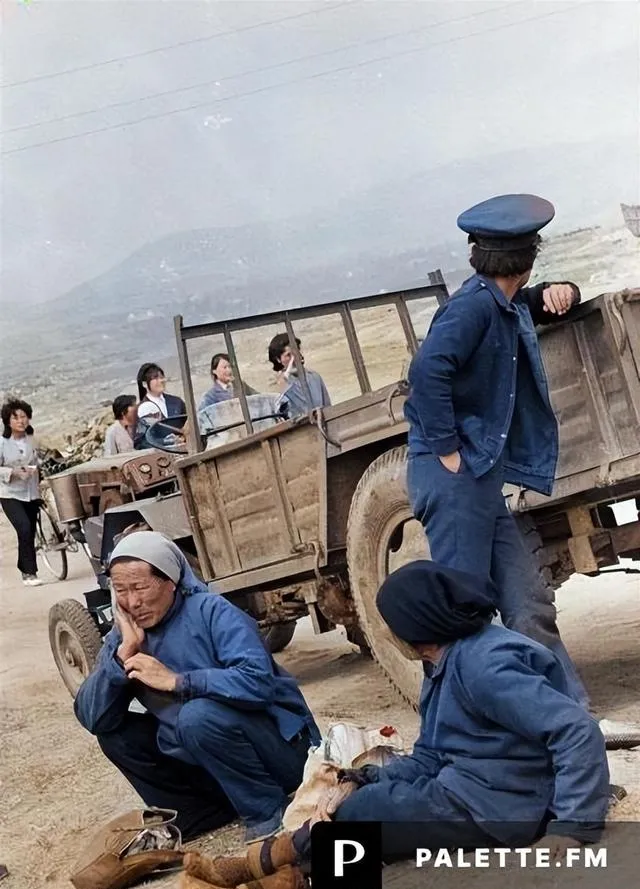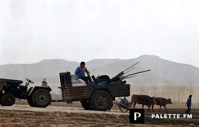 这张竖着的,车靠在路边,老奶奶托腮打盹,年轻人站着看远处的山,风一阵一阵吹过来,车板上留着新钉的痕,铁皮被晒得发烫,谁走近都要嘬一下凉气。