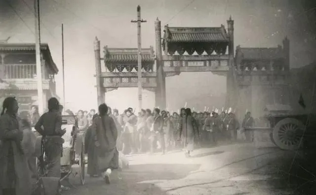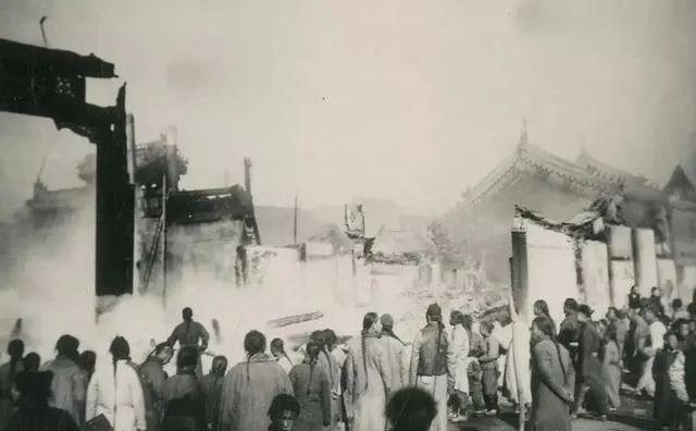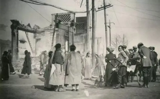 图中这一片断壁残垣就叫城里人的“热闹口”,不是好热闹,是遭了兵火后的看个究竟,电线杆斜着栽,门楼只剩框,女人把棉袄裹紧了,男人缩着脖子往里张望,狗跟在人腿间窜来窜去,谁都想打听一句,到底是哪家倒了灶台。