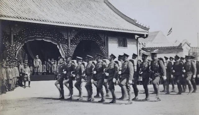 这个高处叫检阅台,台下枪尖排排立,像一排排梭子,台上人把手背在后腰,微微往前探,眼神在队伍里扫,礼帽压得很低,旁边军官在耳边小声嘀咕两句。