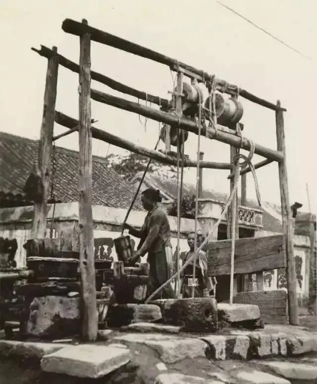 这个高架子叫辘轳井,木梁横着搭,顶上吊两只木桶,水绳缠得发亮,打水的汉子手背青筋绷起,哗啦一声,铁皮水壶就满了,妈妈说,甜水井是抢手的,清早排队,后面的人把桶一碰,前面就回头瞪你一眼。