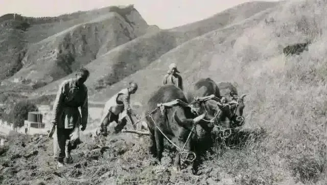 这景儿叫套牛下地,犁梁是榆木的,牛鼻穿着绳,泥地里脚一陷,拔出来“啵”的一声,赶牛的人右手扬鞭不真抽,响个声算打招呼,以前忙时节,太阳像铜钱,刚露边就得下田。