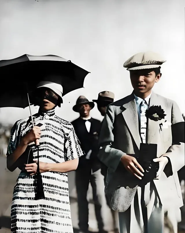 这位手里拿的是盒子相机,身边的姑娘撑着黑白相间的伞,旗袍布料有细密的纹路,风从袖口钻进去鼓鼓的,母亲看见这一张,笑着说,那个时候最讲究的是合身,衣裳不合身,出门都不踏实。